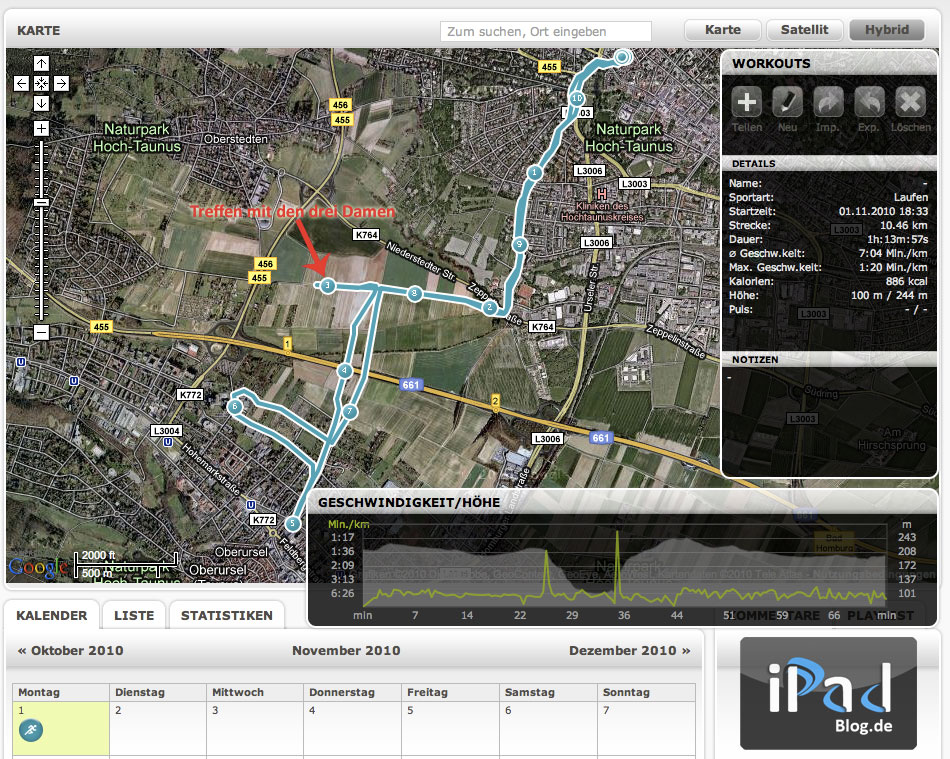 Den ersten Lauf für die iPadBlog Run Challenge startete ich motiviert direkt am Abend des 1. Novembers 2010, denn schliesslich entscheidet auch der erste Eindruck. Gewöhnlich laufe ich 6-8 km an einem Stück, doch dieses Mal war ich sehr motiviert gewesen. Das lag zum Einen an der Tatsache, dass es unser Community-Lauf ist, zum Anderen aber vielmehr die Tatsache, dass ich während meines Laufes auf drei Damen gestossen bin (Grüße an Katharina, Anna und Heike). Diese drei Laufdamen liefen im dunklen Feld und nach ein paar lockeren Gesprächen habe ich sie zur nächsten Stadtgrenze begleitet. Eigentlich länger, als ich ursprünglich wollte, aber freundlicherweise wurde mir der Weg zurück erklärt und so kam es, dass ich alleine den Weg durch dunkle Gasen, vorbei an Schrebergärten und Apfelplantagen vollzog. Die App Endomondo teilte mir bei der Rückkehr ein erfolgreiches Ergebnis von über 10 km mit, welches ich Euch mit dieser spannenden Grafik nicht vorenthalten möchte: