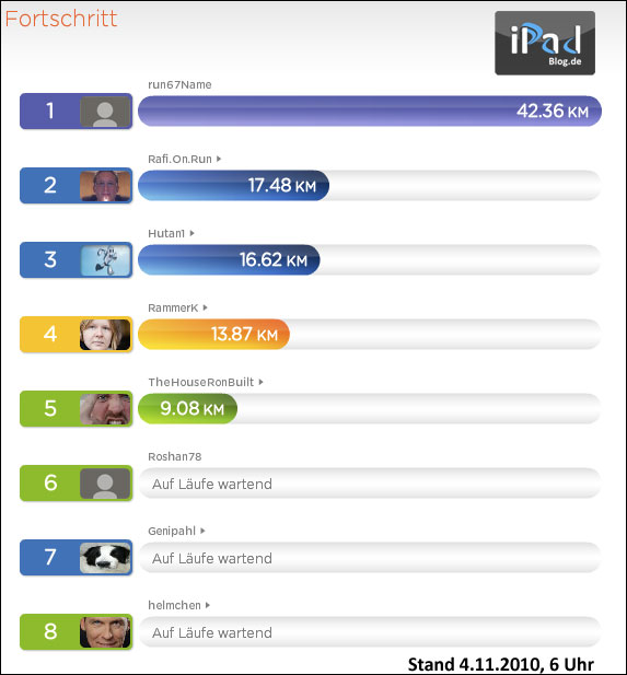 Laufen macht schön und fit. Genau das benötigen wir iPad-User (und alle die es werden wollen) in diesen Tagen. Das Wetter wird uns im November nicht unbedingt zum Laufen einladen, aber die gegenseitige Motivation unserer iPadBlog Community wird dies stark unterstreichen. Mit unseren regelmässigen Veranstaltungen möchten wir Euch vom Schreibtisch weg locken. Ständige Büroarbeiten am PC sind anstrengend. So abwechslungsreich das iPad auch zu sein scheint, es zwingt zu weiterem Sitzen (evtl. noch nach der regulären Bürozeit). Deshalb verbinden aktuell acht Menschen das Nützliche und nehmen kostenfrei an der beliebten Laufveranstaltung unseres Internetdienstes teil: